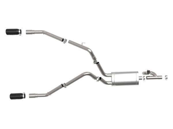 This cat-back exhaust system is constructed of 3 IN mandrel-bent 304 stainless steel tubing for maximum strength and durability. This system features a high-flow stainless steel muffler, producing a aggressive sound. Muffler finish may vary. Finishing off this exhaust system are dual 5 IN diameter black stainless steel clamp-on exhaust tips. The tips features an aFe POWER logo plate riveted on for a unique style. This system produces an aggressive sound unleashing all available horsepower and torque. Utilizing factory style hangers this system is a direct bolt-on system, which requires no cutting or modifications for a hassle-free installation. This kit includes key fob remotes, control module, valve motor, and all necessary wiring. It's a simple installation, requiring no cutting of any wires or interference of the automobile's electronics. This system features an electronically controlled exhaust cutout valve to quickly switch between exhaust tones at the push of a button. Utilizing state-of-the-art computer-aided design technology, this exhaust system is designed for custom, high tolerance factory fitment. 100% MIG-Welded for race-proven strength and durability.