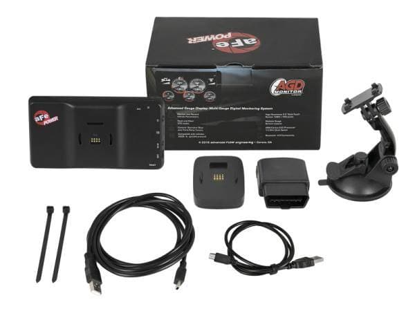 In addition to over 25 parameters available for every single vehicle, there are also multiple application specific options to choose from. With the ability to run specific diagnostic tests as well as read and clear engine codes, the AGD can spot potential issues and ensure your vehicle is running at the best of its ability. In addition to the parameters of your choice, driving coach and vehicle performance data can be monitored. The AGD’s 5.5” multi-touch screen makes for a simple yet good-looking overview of the parameters most important to you. With customizable gauges and multiple different screen layouts available, each display can be tailored to your vehicle’s specific needs and aesthetic. Not only does it work seamlessly in conjunction with aFe POWER’s Scorcher BLUE modules, but the AGD also provides the ability to control multi-position tunes from third-party companies. The AGD simply plugs in to your vehicle's OBDII port. All necessary cables for installation are included. Thanks to its magnetic base, the device can be easily removed from the windshield mount without unplugging any wires.