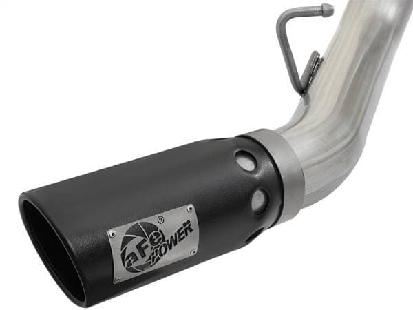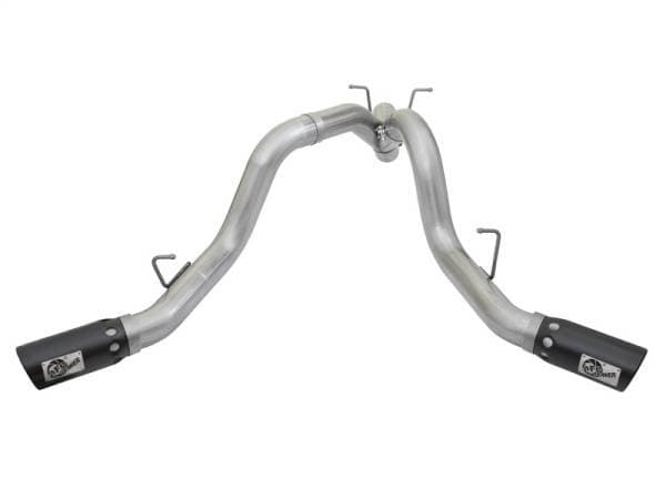 Interested in a new exhaust system for your L5P Duramax? Check out the ATLAS dual DPF-Back exhaust system by aFe. This system is constructed from 4" mandrel-bent aluminized steel tubing and uses high quality band clamps and OE-style bayonet hangers. This unit uses all factory mounting locations and comes with a bolt-on bracket that supports the driver side tailpipe. This provides for a quick, hassle-free installation with no modification necessary. Also included in this exhaust system are dual massive 6" polished 304 stainless steel tips with laser-cut stainless steel aFe power badges. ATLAS exhaust systems are the perfect combination of performance, fit and value. Single To Dual Exhaust Conversion: This exhaust is designed to convert the standard single exhaust into an aggressive dual exhaust. Fits With Spare Tire: This exhaust system fits perfectly without relocating the spare tire. OE Fit: OE-style bayonet hangers are used to maintain a stable pipe location during high vibration and high heat conditions. The bayonet tip holds the hanger bushing in place for an OE style fit that does not change with time. Flow and Performance: This ATLAS exhaust system is constructed of 4" mandrel-bent aluminized steel tubing for maximum flow. Smooth transition bends allow for low turbulence, increasing horsepower, torque and lowering EGT's. Dual Massive 6" Black Tips: Finishing off the exhaust are dual powder-coated high temp black 304 stainless steel exhaust tips. This tip features a laser-cut stainless steel aFe power badge for an aggressive style.