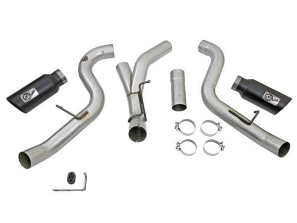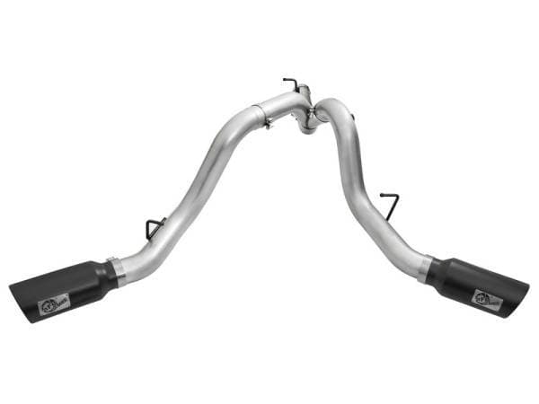Interested in a new exhaust system for your LML Duramax? Check out the ATLAS Dual DPF-Back exhaust system by aFe. This system is constructed from 4" mandrel-bent aluminized steel tubing and uses high quality band clamps and OE-style bayonet hangers. This unit uses all factory mounting locations to provide a quick, hassle-free installation. Also included in this exhaust system are dual massive 6" high temp black powder-coated stainless steel tips with laser-cut stainless steel aFe power badges.. Also included in this exhaust system are dual massive 6" high temp black powder-coated stainless steel tips with laser-cut stainless steel aFe power badges. ATLAS exhaust systems are the perfect combination of performance, fit and value. Single To Dual Exhaust Conversion: This exhaust is designed to convert the standard single exhaust into an aggressive dual exhaust. Fits With Spare Tire: This exhaust system fits perfectly without relocating the spare tire. OE Fit: OE-style bayonet hangers are used to maintain a stable pipe location during high vibration and high heat conditions. The bayonet tip holds the hanger bushing in place for an OE-style fit that does not change with time. Flow and Performance: This ATLAS exhaust system is constructed of 4" mandrel-bent aluminized steel tubing for maximum flow. Smooth transition bends allow for low turbulence, increasing horsepower, torque and lowering EGT's. Massive 6" Black Tips: Finishing off the exhaust are dual powder-coated high temp black 304 stainless steel exhaust tips. This tip features a laser-cut stainless steel aFe power badge for an aggressive style.