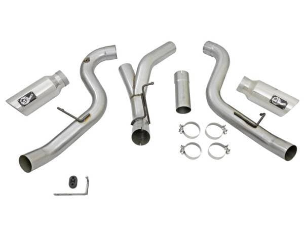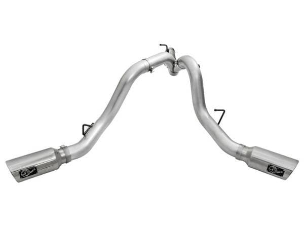Interested in a new exhaust system for your LML Duramax? Check out the ATLAS dual DPF-Back exhaust system by aFe. This system is constructed from 4" mandrel-bent aluminized steel tubing and uses high quality band clamps and OE-style bayonet hangers. This unit uses all factory mounting locations and comes with a bolt-on bracket that supports the driver side tailpipe. This provides for a quick, hassle-free installation with no modification necessary. Also included in this exhaust system are dual massive 6" polished 304 stainless steel tips with laser-cut stainless steel aFe power badges. ATLAS exhaust systems are the perfect combination of performance, fit and value. Single To Dual Exhaust Conversion: This exhaust is designed to convert the standard single exhaust into an aggressive dual exhaust. Fits With Spare Tire: This exhaust system fits perfectly without relocating the spare tire. OE Fit: OE-style bayonet hangers are used to maintain a stable pipe location during high vibration and high heat conditions. The bayonet tip holds the hanger bushing in place for an OE style fit that does not change with time. Flow and Performance: This ATLAS exhaust system is constructed of 4" mandrel-bent aluminized steel tubing for maximum flow. Smooth transition bends allow for low turbulence, increasing horsepower, torque and lowering EGT's. Polished Tips: Finishing off the exhaust are dual high luster, polished 304 stainless steel slash-cut tips. This tip features a laser-cut stainless steel aFe power badge for an aggressive style.