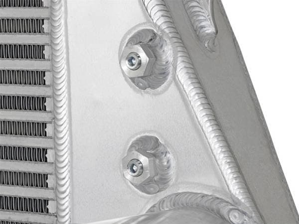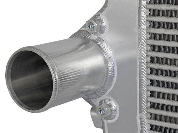 This BladeRunner Intercooler represents the next generation of intercoolers. The BladeRunner intercoolers utilize a 3.15" thick bar and plate design that is 44% larger than stock and outflows OE style tube and fin core designs by 40%! Silicone Couplers with beads are used for a leak-free seal. No blowouts with this coupler. End Tanks: The unique BladeRunner end tanks are constructed out of 3/16" TIG welded aluminum plate tanks that incorporate three multi-directional vanes. Multi-Directional Vane Technology: The BladeRunner MDV technology is used to direct hot air flow through the entire intercooler core. This allows for greater cooling than competitors units. 3.15" Thick Bar and Plate Core: The use of the bar and plate core design allows for greater airflow and increased heat dissipation over the much smaller tube and fin design used by the OEM. Multiple Auxiliary Ports: Four tapped 1/8" ports are supplied on the tanks for easy installation of gauges or nitrous oxide systems. Billet Aluminum Inlet/Outlets: Each BladeRunner Intercooler uses billet aluminum inlets and outlets for superior strength and durability. The 3-1/2" inlet/outlet with reducer couplings to match stock tubes. Tig-Welded: 100% TIG-Welded by certified craftsmen for race proven strength and durability. TIG-Welding provides the strongest welds reducing stress cracks. Flow and Performance: The intercooler tube is constructed of 3" mandrel bent powder-coated stainless steel tubing for maximum flow. Smooth transition bends allow for low turbulence, increasing horsepower, torque and lowering EGT's. Comes complete with 4-ply heavy duty couplings and constant tension T-bolt clamps for a tight and secure installation. The BladeRunner Intercooler is test pressure rated at 200psi which is perfect for high boost applications. Don't waste your time and money on modified factory intercoolers. Invest in the aFe BladeRunner intercooler, the most sophisticated intercooler design on the planet.