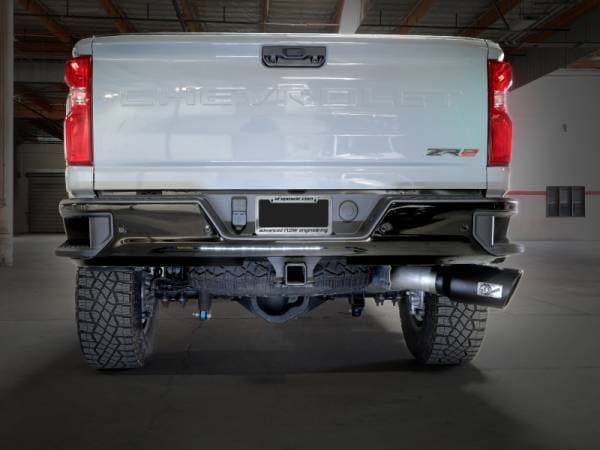 This DPF-Back exhaust system is constructed of 5" mandrel-bent 409 stainless steel tubing for maximum strength and durability. Finishing off this exhaust system is a 7" diameter black 304 stainless steel clamp-on exhaust tip. The tip features an aFe POWER logo plate riveted on for a unique style. Some cutting may be required, see instruction sheet for further information. Utilizing factory style hangers this system mounts directly to factory mounting locations for a hassle-free installation. Utilizing state-of-the-art computer-aided design technology, this exhaust system is designed for custom, high tolerance factory fitment. 100% MIG-Welded for race-proven strength and durability.