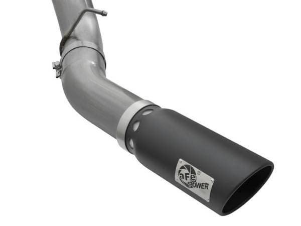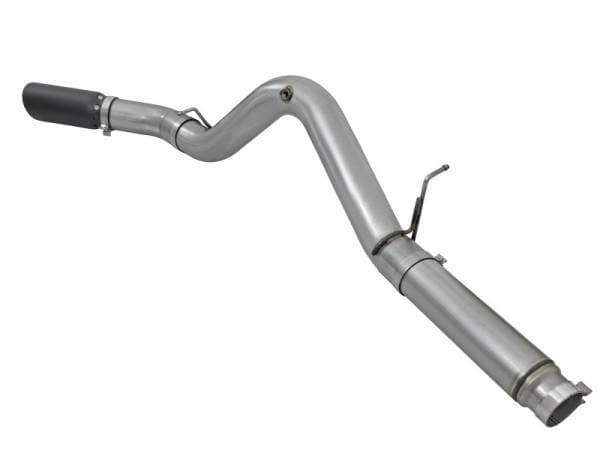 Interested in a new exhaust system for your LML Duramax? Check out the Large Bore-HD DPF-Back exhaust system by aFe. This system is constructed from 5" mandrel-bent 409 stainless steel tubing and uses high quality band clamps and OE-style bayonet hangers. This unit uses all factory mounting locations to provide a quick, hassle-free installation. Also included in this exhaust system is a massive 6" wrinkle-black powder-coated 304 stainless steel tip with a laser-cut stainless steel aFe power badge. Large Bore-HD exhaust systems are the perfect combination of performance, fit and value. Simple Installation: All systems use factory mounting locations providing stability and hassle-free installation. Leak-Free Seal: High quality band clamps are included for a complete 360 degree sealing surface. OE Fit: OE-style bayonet hangers are used to maintain a stable pipe location during high vibration and high heat conditions. The bayonet tip holds the hanger bushing in place for an OE-style fit that does not change with time. Flow and Performance: This Large Bore-HD exhaust system is constructed of 5" mandrel-bent stainless steel tubing for maximum flow. Smooth transition bends allow for low turbulence, increasing horsepower, torque and lowering EGT's. 6" Diameter Black Intercooled Tip: Finishing off the exhaust is a 6" diameter, black, stainless steel slash cut tip with intercooling vents designed to reduce exhaust gas temperatures at the tailpipe. A unique stainless steel laser-cut aFe Power logo plate is riveted on for an aggressive style.
