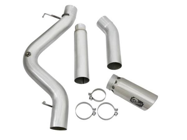 Interested in a new exhaust system for your LML Duramax? Check out the Large Bore-HD DPF-Back exhaust system by aFe. This system is constructed from 5" mandrel-bent 409 stainless steel tubing and uses high quality band clamps and OE-style bayonet hangers. This unit uses all factory mounting locations to provide a quick, hassle-free installation. Also included in this exhaust system is a massive 6" wrinkle-black powder-coated 304 stainless steel tip with a laser-cut stainless steel aFe power badge. Large Bore-HD exhaust systems are the perfect combination of performance, fit and value. Simple Installation: All systems use factory mounting locations providing stability and hassle-free installation. Leak-Free Seal: High quality band clamps are included for a complete 360 degree sealing surface. OE Fit: OE-style bayonet hangers are used to maintain a stable pipe location during high vibration and high heat conditions. The bayonet tip holds the hanger bushing in place for an OE-style fit that does not change with time. Flow and Performance: This Large Bore-HD exhaust system is constructed of 5" mandrel-bent stainless steel tubing for maximum flow. Smooth transition bends allow for low turbulence, increasing horsepower, torque and lowering EGT's. 6" Diameter Polished Intercooled Tip: Finishing off the exhaust is a 6" diameter, high luster polished, stainless steel slash cut tip with intercooling vents designed to reduce exhaust gas temperatures at the tailpipe. A unique stainless steel laser-cut aFe Power logo plate is riveted on for an aggressive style.