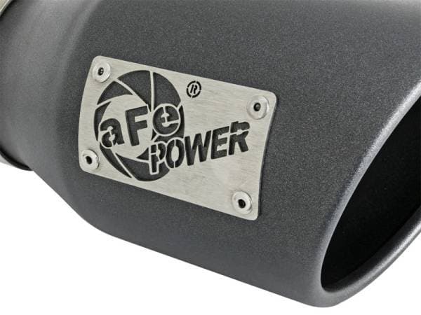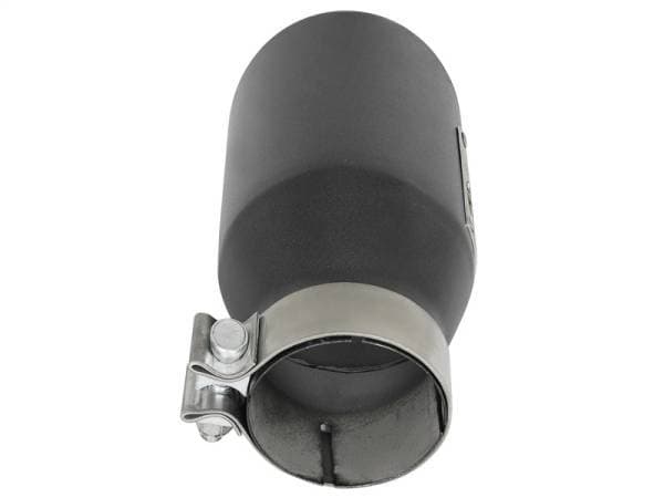 Finish off your custom or stock exhaust system with the Mach Force Xp 409 stainless steel, universal tip designed to fit most 3" exhaust systems. This 9" long, double-walled, slash cut exhaust tip is finished with a high-temperature, metallic black powder coating for corrosion resistance and a custom look. A unique laser-cut aFe Power logo plate is riveted on for brand quality authenticity and has a drain port built in for convenience. Completely adjustable, the tip includes a high quality stainless steel band clamp so there's no modification or welding required. Stainless Steel Construction This tip is constructed using 409 stainless steel for maximum strength and durability. High Temp. Metallic Black Coating A high-te mperature metallic black powder coating has been applied to the tip for corrosion resistance and custom look. Drain Port A drain port on the bottom of the tip expends loose particles and condensation. aFe Badging This tip features an aFe POWER laser-cut logo plate that is riveted on for brand quality authenticity Leak-Free Seal A high quality stainless steel band clamp is used for a complete 360 degree sealing surface Universal Fit Universal tip - will fit to 3" stainless steel tubing. Tip comes slotted. See below for specifications. Tip Specifications 3" inlet x 4-1/2" outlet x 9" length, slotted