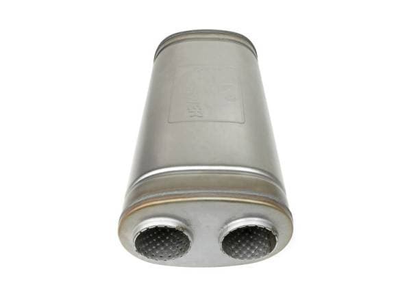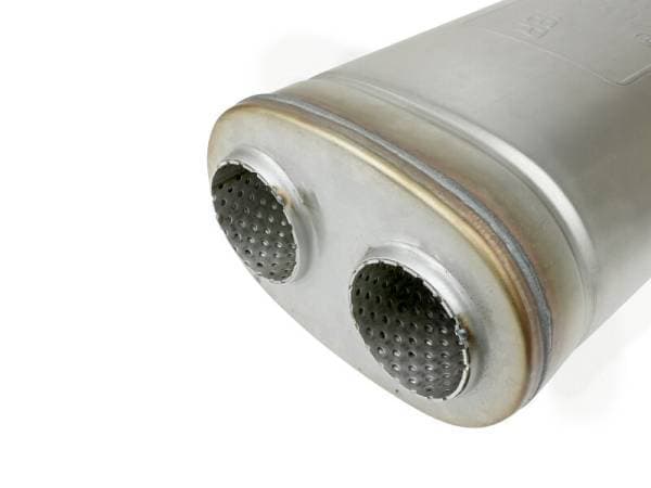 Constructed of 409 stainless steel for long lasting strength and durability. Designed for exhaust gasses to travel straight through the heat resistant perforated core for a remarkable tone. Universal muffler fits 2-1/2" stainless steel tubing. See below for specifications. Configuration: 2-1/2 IN Dual Inlet/Dual Outlet, 5 IN x 8 IN x 18 IN Body. Features an aFe POWER logo stamped onto the muffler for quality, brand authenticity.