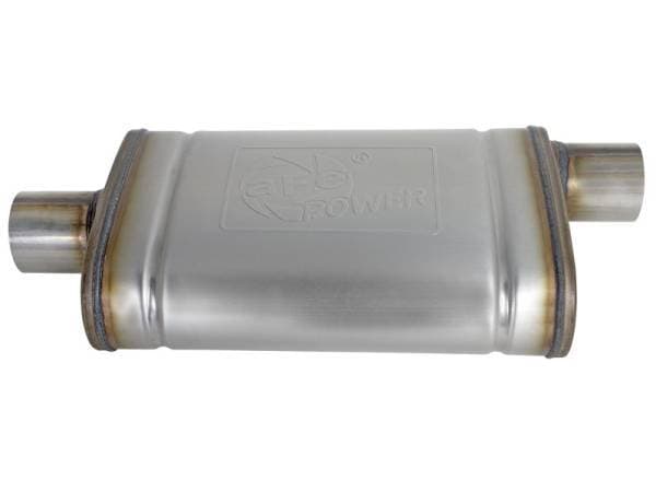 The aFe Universal fit 409 Stainless Steel Performance Muffler is designed to provide a deep, throaty, powerful sound on acceleration but maintain a smooth sound at idle. This muffler is constructed of brushed finished 409 stainless steel and uses a straight through perforated core with heat resistant packing to reduce backpressure and maximize exhaust flow.? You will see increased performance and improved throttle response over the factory exhaust. Muffler Specifications: 2-1/2" In/Out, Center/Offset 14"L x 9"W x 4"H