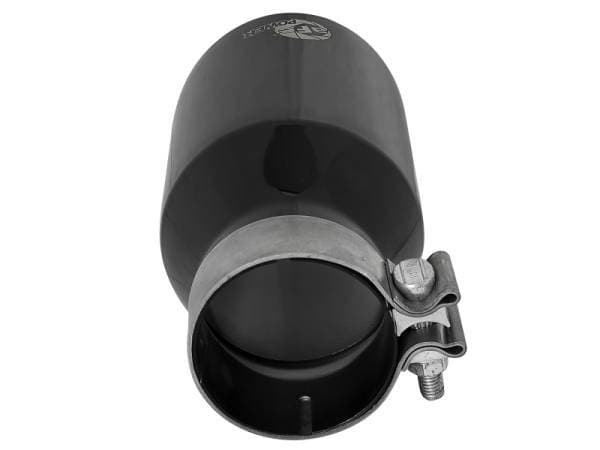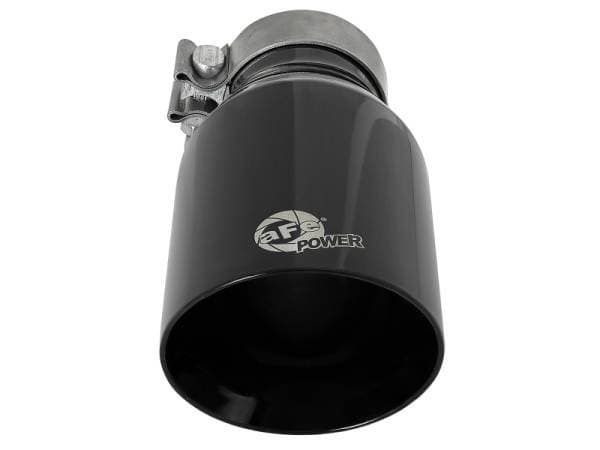Stainless Steel Construction: This tip is constructed using 304 stainless steel for maximum strength and durability. High Gloss Black Finish: Powder coated in high gloss black finish for a quality, custom look. Laser Etched aFe POWER Logo: Branded with a laser etched aFe Power logo for quality authenticity. Secure Fitment: A high quality stainless steel barrel band clamp is used for a complete 360 degree sealing surface. Universal Fit: Universal tip - will fit to 3" exhaust tubing and is easy to install and adjustable. See below for specifications. Tip Specifications: 3" inlet x 4-1/2" outlet x 9" overall length Emissions Disclaimer: This product does not require a CARB EO#