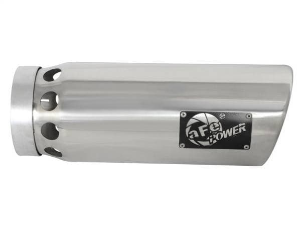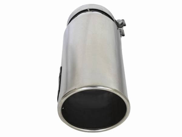 aFe Power is proud to introduce an all new intercooled exhaust tip. This tip comes with a polished finish and is designed to fit 5 exhaust systems. With a 5 inlet x 6 outlet and 16 inch length, this single-walled, angle cut rolled tip comes with intercooling vents and a unique laser-cut aFe Power logo plate riveted on for an aggressive style.
