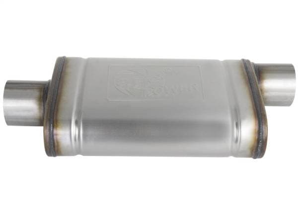 The aFe Universal fit 409 Stainless Steel Performance Muffler is designed to provide a deep, throaty, powerful sound on acceleration but maintain a smooth sound at idle. This muffler is constructed of brushed finished 409 stainless steel and uses a straight through perforated core with heat resistant packing to reduce backpressure and maximize exhaust flow. You will see increased performance and improved throttle response over the factory exhaust. Muffler Specs: 3" In/Out- 4" x 9" Body