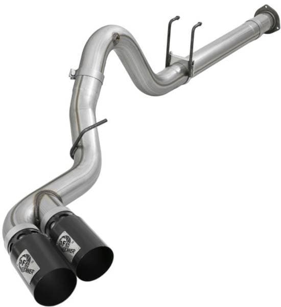 This DPF-back exhaust system is constructed of 4" mandrel-bent 409 stainless steel tubing for maximum strength and durability. Finishing off this exhaust system are dual 5" diameter black 304 stainless steel intercooled clamp-on exhaust tips. The tips features an aFe POWER logo plate riveted on for a unique style. Some cutting may be required, see instruction sheet for further information. Utilizing a factory style flange and hangers this system mounts directly to factory mounting locations for a hassle-free installation. OE-style bayonet hangers are used to maintain a stable pipe location during high vibration and high heat conditions. The bayonet tip holds the hanger bushing in place for an OE-style fit that does not change with time. 100% MIG-Welded for race-proven strength and durability.