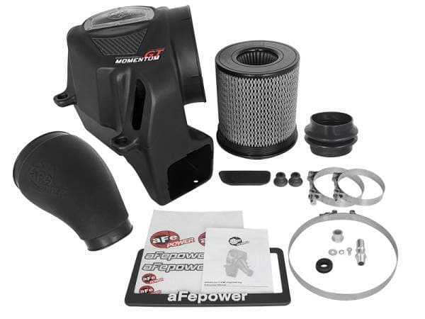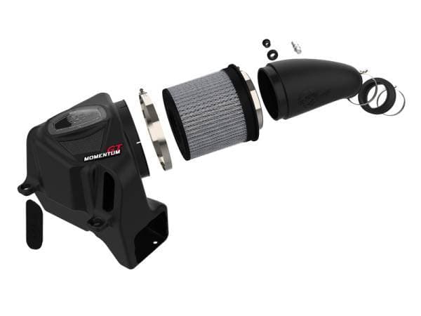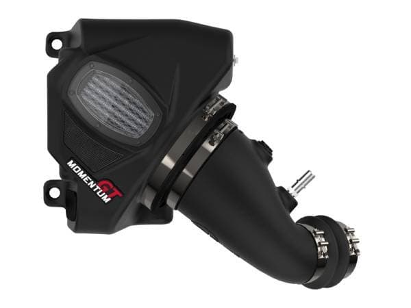 Unique One-Piece High Quality Housing W/ Sight Window: A custom CAD designed roto-molded housing made from heat resistant material eliminates the use of multiple components and ensures the coolest air intake charge available. A large clear sight window allows for filter inspection without removal of the airbox. The roto-molded housing is made out of black cross-linked polyethylene. Carbon Fiber Accent are provided for car show quality and to further distinguish your vehicle from others. High Quality Tube: This system uses a high quality plastic CAD designed, dyno-tuned, roto-molded intake tube to achieve maximum power gains while maintaining a perfect fit. Also included is a high quality billet aluminum crankcase fitting and temp sensor fitting for easy installation. Huge 3-Layer Performance Air Filter: The Momentum GT intake is designed around an oil-free, large 8" round 360 degree radial flow performance air filter with 3-layers of progressive finer porosity synthetic media providing maximum convenience. The unique air filter to housing interface (patent pending) allows for maximum filter size which increases the available air volume while simplifying the installation process. The air filter is wrapped in reinforced metal providing maximum strength to prevent filter collapse. Premium Hardware: Premium stainless steel T-bolt clamps and a silicone double hump coupling are used for strength and durability while also providing the most secure installation available. Momentum GT intakes are designed with fewer parts for a quick and simple installation. NOTE; This intake system is not CARB exempt at this time and is not legal for sale in California or use on vehicles registered with the California Department of Motor Vehicles