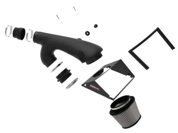 This 5-3/4” tall 360-degree radial flow air filter features a 5-1/2" flange and our oil-free Pro DRY S media with three layers of synthetic media for maximum convenience. Its progressive layering provides great filtration efficiency and dust holding capacity, while not requiring the use of oils. This media is best suited for street use. Its inverted top makes for more filter surface area, resulting in longer service intervals. aFe POWER developed this heat shield to snap onto the top of the lower half of the factory air box to provide a hassle-free installation utilizing factory mounting locations. This system features a high quality, computer-designed, dyno-tuned intake tube to achieve maximum power gains while maintaining a perfect fit. Its XLPE (cross-linked polyethylene) material is heat soak resistant and extremely durable. The computer designed system utilizes factory mounting locations, minimizing the use of unnecessary hardware, and ensuring a perfect fit every time. This is a direct bolt-on kit that requires no cutting or drilling on factory parts. Stainless-steel clamps are included for strength, and premium silicone couplings allow for ample flexibility. This air intake system works perfectly in combination with aFe POWER D.A.S. (Dynamic Air Scoop): 52-10010S(Black), 52-10010SR(Red) and 52-10010SL(Blue).