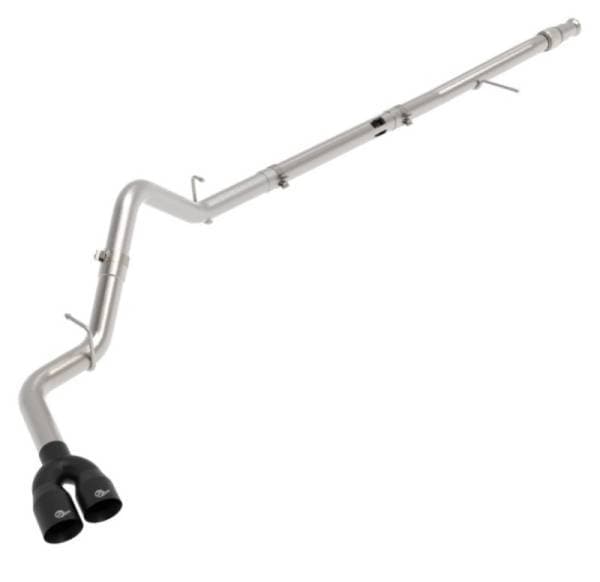 This DPF-back exhaust system is constructed of 3" mandrel-bent 304 stainless steel tubing for maximum strength and durability. Finishing off this exhaust system are dual 3-1/2" diameter black 304 stainless steel middle-side exit exhaust tips. The tips features a laser etched aFe POWER logo for a unique style.Utilizing factory style hangers this system is a direct bolt-on system, which requires no cutting or modifications for a hassle-free installation. This DPF-back exhaust system uses a heavy duty flex pipe with an internal interlock liner for added strength and durability. Utilizing state-of-the-art computer-aided design technology, this exhaust system is designed for custom, high tolerance factory fitment. 100% MIG-Welded for race-proven strength and durability. Intercooled tubing provides reduction in exhaust gas temperatures.