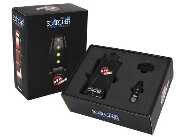 In-Cabin, on-the-fly power adjustments can be made to accommodate your driving needs. Select one of four power settings on the in-cab LED control switch or control the module remotely via the free iOS or android app. The smartphone connects to the module via Bluetooth and displays engine parameters (MAP and engine load). This Power module have 4-power settings loaded and identifiable with the LED light on the switch or smartphone app. Stock (Green), Sport (Yellow), Sport+ (Orange) and Race (Red). The SCORCHER BLUE module is Bluetooth 4.0 capable and can connect to most iOS or android device. The Bluetooth connectivity allows the control of the module while being in the vehicle cabin without running any wire through the firewall. The aFe POWER SCORCHER BLUE app is free on the APP Store and Google Play store and allows the smartphone device to become a handheld remote for the module. It also displays turbo boost gauges and engine load, allows you to customize each power mode, upgrade to the latest revision and even measure 0 to 60 and ¼ mile times. aFe POWER does not recommend using the SCORCHER BLUE module with any other tuners or modules. aFe POWER recommends that only Sport or Sport + settings are used during towing.