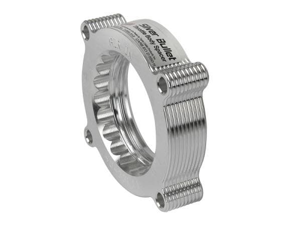 Silver Bullet throttle body spacers create turbulence in the air flow at the point just prior entry into the engine increasing horsepower, torque and improving throttle response and fuel efficiency. Silver Bullet throttle body spacers are constructed out of durable T-6061 billet aluminum and using a unique serrated/helix entry to create turbulence at the manifold while eliminating the annoying whistle found in other helix only throttle spacers.