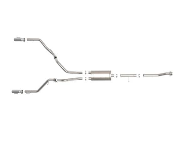 This cat-back exhaust system is constructed of 3 IN mandrel-bent 304 stainless steel tubing for maximum strength and durability. This system features a high-flow 409 stainless steel muffler, producing a aggressive sound. Finishing off this exhaust system are dual 4-1/2 IN diameter polished 304 stainless steel clamp-on exhaust tips. The tips features an aFe POWER logo plate riveted on for a unique style. This system produces an aggressive sound unleashing all available horsepower and torque. Utilizing a factory style flange and hangers this system is a direct bolt-on system, which requires no cutting or modifications for a hassle-free installation. Utilizing state-of-the-art computer-aided design technology, this exhaust system is designed for custom, high tolerance factory fitment. 100% MIG-Welded for race-proven strength and durability.