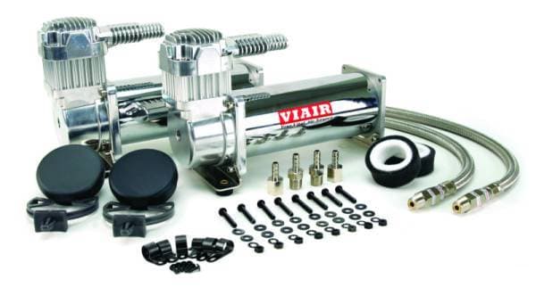 444C dual pack compressors feature a head assembly that includes a newly-developed, patents pending intercooler head. Additionally, they are equipped with a stainless steel braided leader hose with inline check valve assembly that serves to protect the compressor by eliminating the possibility of high amperage restarts. Included parts: (2) 444C Chrome Compressors Patents Pending Intercooler Head (2) Air Filter Assemblies (2) Remote Mount Brackets (2) Sets of Remote Mount Fittings (2) Sets of Spare Air Filter Elements (8) Sets of Nuts, Bolts, Washers and Lock Washers (2) Stainless Steel Braided Leader Hoses with Inline Check Valve (6) Airline Clips Does not include relays, pressure switch or air line for remote air filter relocation Specifications: 12-Volt Permanent Magnetic Motor Duty Cycle: 100% @ 100 PSI Max. Working Pressure: 200 PSI Max. Amp Draw: 38 Amps Net Weight: 21.60 lbs.
