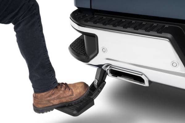 Go ahead and step on it. Bedstep is a real time saver. Not to mention knee and back saver. Strong and rugged, this non-slip, retractable bumper step quickly flips down with the nudge of a foot providing a faster, easier and safer way to load or unload your pickups cargo. Supports up to 300 lbs. Frame mounts under the rear bumper so it works even with an open tailgate or when towing.