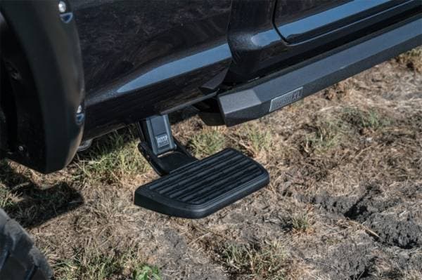 Side steps for hard-working trucks. The AMP Research Bedstep2 mounts just behind the cab, forward of the rear wheel, providing a faster, easier and safer route to access toolboxes, equipment and cargo in the bed. Easily installed, this frame-mounted, retractable truck step can be mounted on either side of the truck box, and it flips down or retracts with just the nudge of your foot.