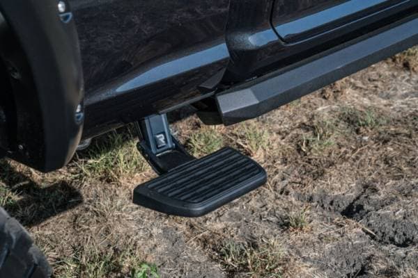 Side steps for hard-working trucks. The AMP Research Bedstep2 mounts just behind the cab, forward of the rear wheel, providing a faster, easier and safer route to access toolboxes, equipment and cargo in the bed. Easily installed, this frame-mounted, retractable truck step can be mounted on either side of the truck box, and it flips down or retracts with just the nudge of your foot.