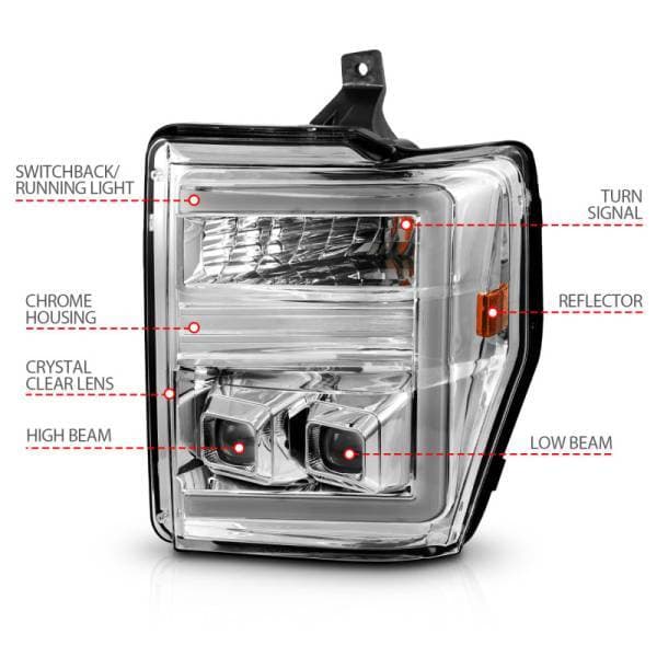 Projector Headlights w/ Light Bar Style - Switchback - Chrome Housing - Clear Lens - Pair; Projector Headlight Set; Clear Lens; Chrome Housing; w/Light Bar Switchback; Pair