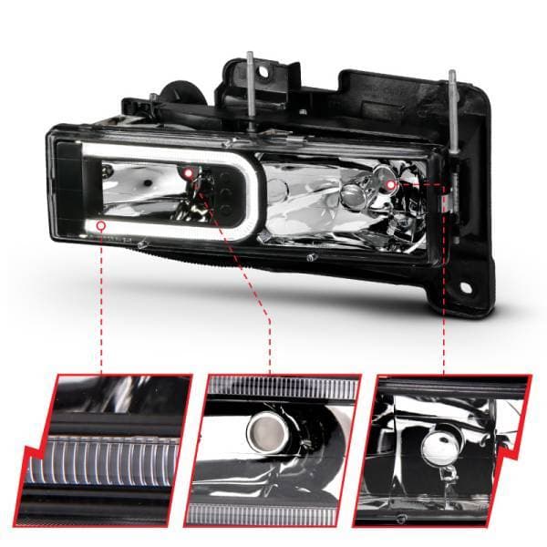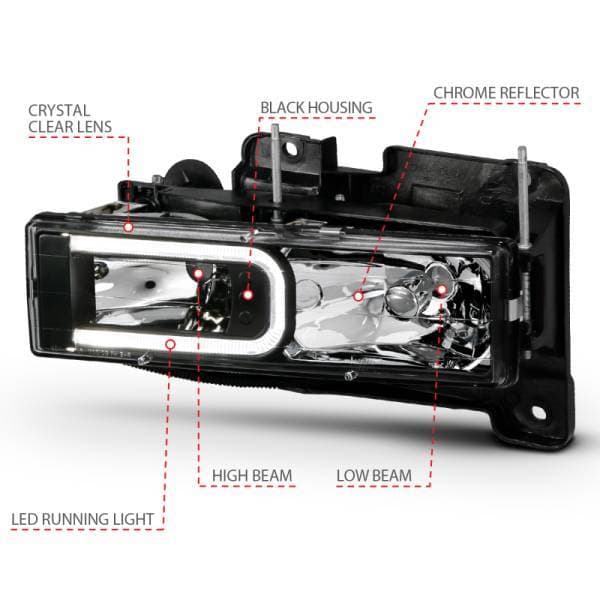 Crystal Headlight Set w/ LED Light Bar Style - Black Housing - Clear Lens - Pair; Crystal Headlight Set; Clear Lens; Chrome Housing; Pair; w/Light Bar