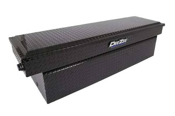 Dee Zee Tool Box - Blue Label (Contractor Grade) Single Lid Crossover. Constructed of heavy gauge Brite-Tread aluminum. Large push button with self-adjusting latches. Hidden hinge, gas shocks, Alumaguard strengthening channel, and adjustable strikers on a hat style lid.