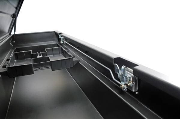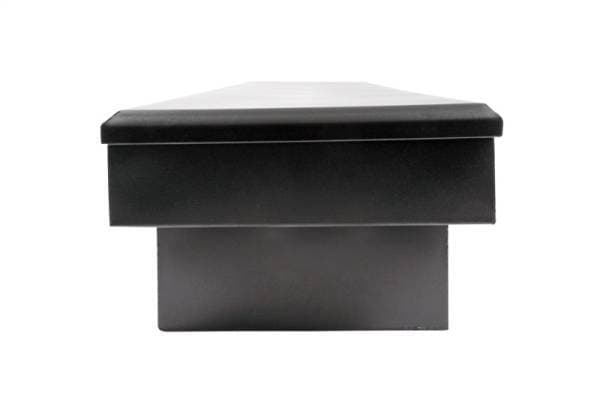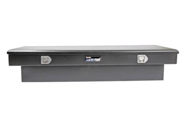 Dee Zee Tool Box - Hardware Series Single Lid Crossover. Constructed of durable 20-gauge steel. Protected by texture black NRT(TM) (No Rust Technology) rust inhibitor powder coat finish. Crown style lid with a full pan double-V stiffener for superior rigidity. Other features: lockable stainless steel paddle handles, dampened gas shocks, closed cell foam gasket, and self-adjusting strikers. Removable plastic tool tray to help keep small items organized.