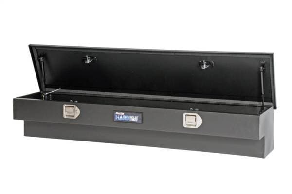 Dee Zee Tool Box - Hardware Series Side Mount Boxes. Constructed of durable 20-gauge steel. Protected by texture black NRT(TM) (No Rust Technology) rust inhibitor powder coat finish. Crown style lid with a full pan double-V stiffener for superior rigidity. Other features: lockable stainless steel paddle handles, dampened gas shocks, closed cell foam gasket, and self-adjusting strikers.