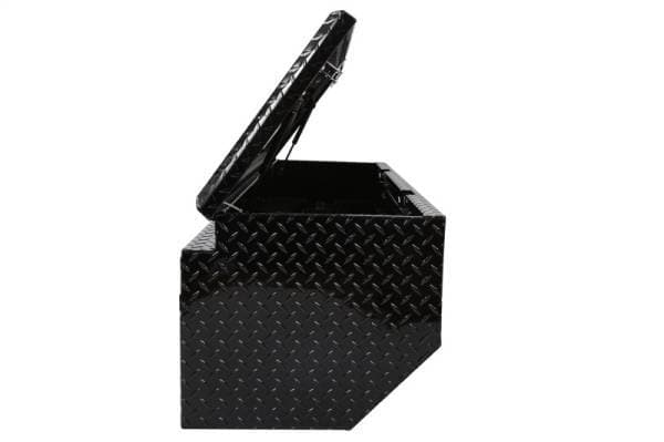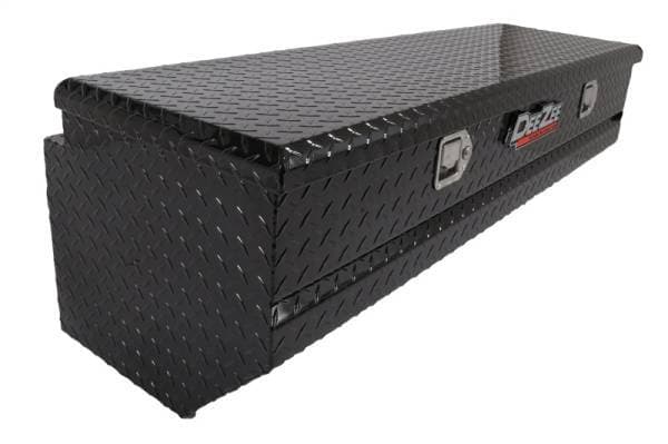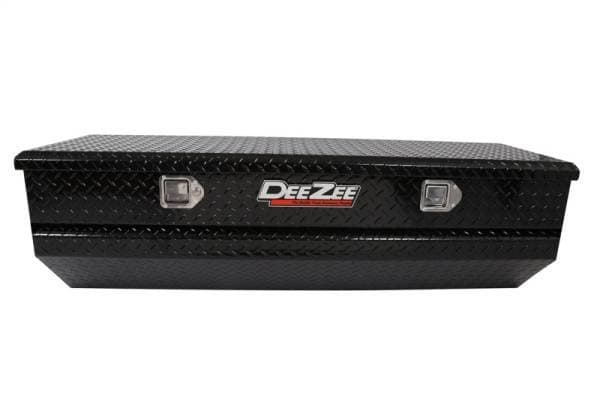 Dee Zee Tool Box - Red Label Chest. Constructed of heavy duty Brite-Tread aluminum. Black-Tread powder coat, provides a gloss black finish while it protects and prevents oxidation. Crown style lid with a full pan double-V stiffener for superior rigidity. Slanted front design to clear wheel well impact. Other features: lockable stainless steel paddle handles, dampened gas shocks, closed cell foam gasket, and self-adjusting strikers. Removable plastic tool tray to help keep small items organized.