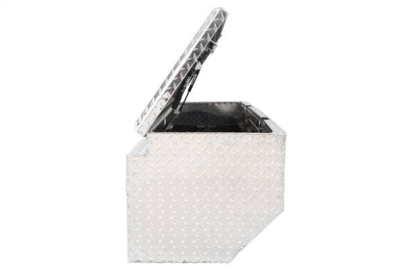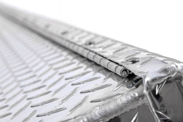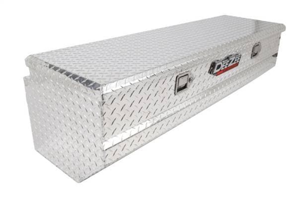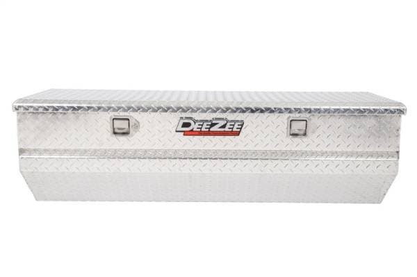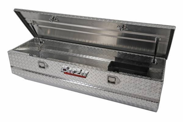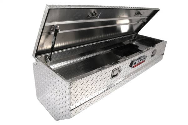 Dee Zee Tool Box - Red Label Chest. Constructed of heavy duty Brite-Tread aluminum. Crown style lid with a full pan double-V stiffener for superior rigidity. Slanted front design to clear wheel well impact. Other features: lockable stainless steel paddle handles, dampened gas shocks, closed cell foam gasket, and self-adjusting strikers. Removable plastic tool tray to help keep small items organized.