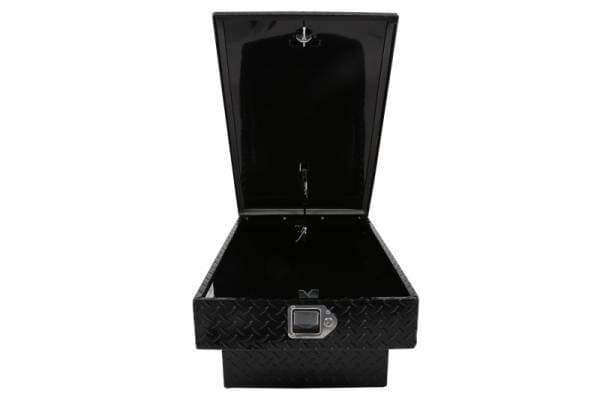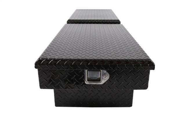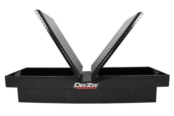 Dee Zee Tool Box - Red Label Double Lid (Gull Wing) Crossover. Constructed of heavy duty Brite-Tread aluminum. Black-Tread powder coat, provides a gloss black finish while it protects and prevents oxidation. Crown style lid for superior rigidity. Other features: lockable stainless steel paddle handles, dampened gas shocks, closed cell foam gasket, and self-adjusting strikers. Removable plastic tool tray to help keep small items organized.