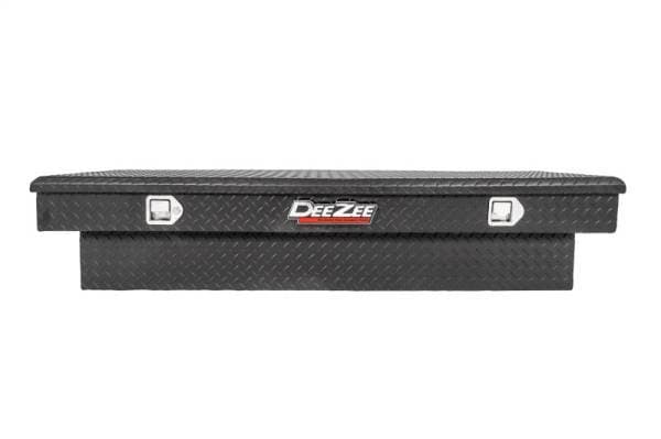 Dee Zee Tool Box - Red Label Single Lid Crossover. Constructed of heavy duty Brite-Tread aluminum with low profile design. Texture black powder coat, provides a matte black finish while it protects and prevents oxidation. Crown style lid with a full pan double-V stiffener for superior rigidity. Other features: lockable stainless steel paddle handles, dampened gas shocks, closed cell foam gasket, and self-adjusting strikers. Removable plastic tool tray to help keep small items organized.