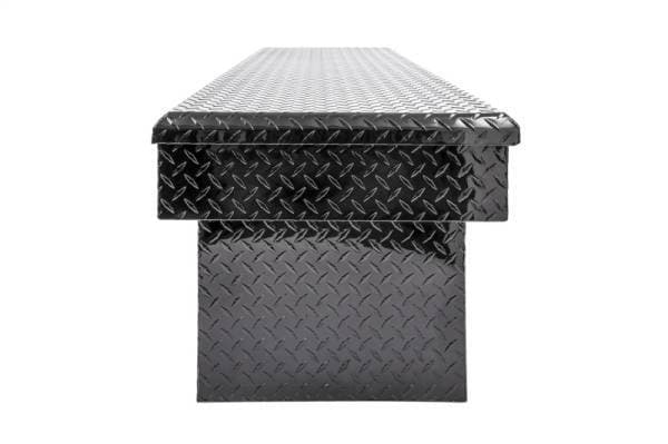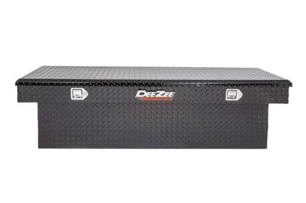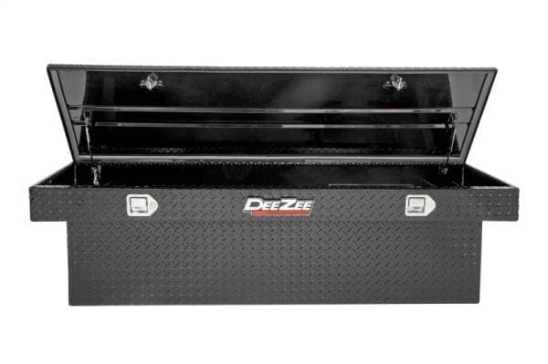 Dee Zee Tool Box - Red Label Single Lid Crossover. Constructed of heavy duty Brite-Tread aluminum with extra deep design for extra storage space. Black-Tread powder coat, provides a gloss black finish while it protects and prevents oxidation. Crown style lid with a full pan double-V stiffener for superior rigidity. Other features: lockable stainless steel paddle handles, dampened gas shocks, closed cell foam gasket, and self-adjusting strikers. Removable plastic tool tray to help keep small items organized.