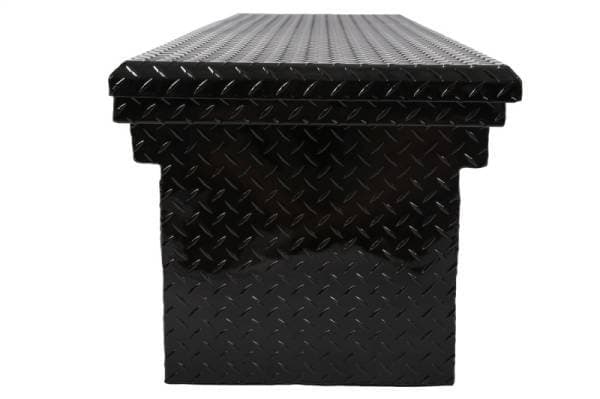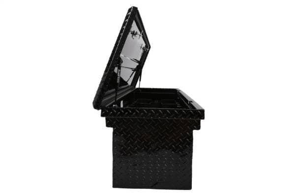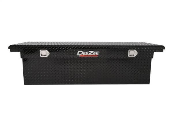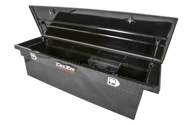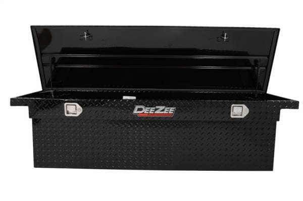 Dee Zee Tool Box - Red Label Single Lid Crossover. Constructed of heavy duty Brite-Tread aluminum with low profile design. Extra deep bottom for maximum storage capacity. Black-Tread powder coat, provides a gloss black finish while it protects and prevents oxidation. Crown style lid with a full pan double-V stiffener for superior rigidity. Other features: lockable stainless steel paddle handles, dampened gas shocks, closed cell foam gasket, and self-adjusting strikers. Removable plastic tool tray to help keep small items organized.