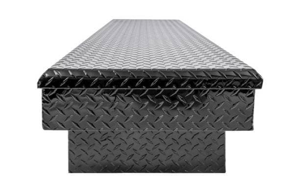 Dee Zee Tool Box - Red Label Single Lid Crossover. Constructed of heavy duty Brite-Tread aluminum. Black-Tread powder coat, provides a gloss black finish while it protects and prevents oxidation. Crown style lid with a full pan double-V stiffener for superior rigidity. Other features: lockable stainless steel paddle handles, dampened gas shocks, closed cell foam gasket, and self-adjusting strikers. Removable plastic tool tray to help keep small items organized.