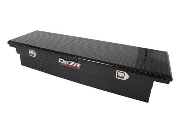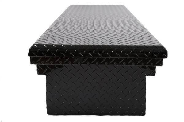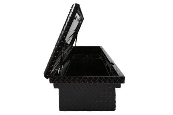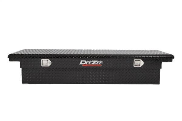 Dee Zee Tool Box - Red Label Single Lid Crossover. Constructed of heavy duty Brite-Tread aluminum with low profile design. Black-Tread powder coat, provides a gloss black finish while it protects and prevents oxidation. Crown style lid with a full pan double-V stiffener for superior rigidity. Other features: lockable stainless steel paddle handles, dampened gas shocks, closed cell foam gasket, and self-adjusting strikers. Removable plastic tool tray to help keep small items organized.