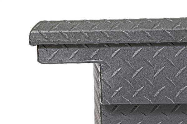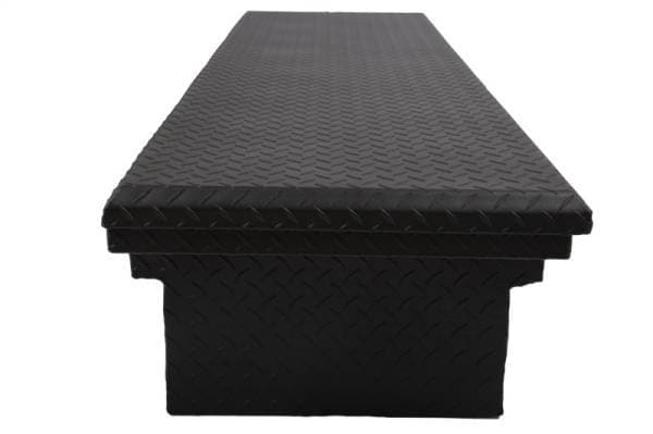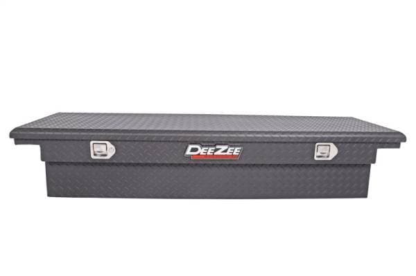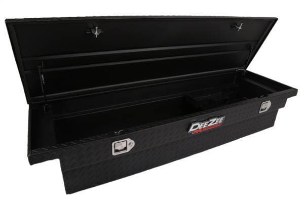 Dee Zee Tool Box - Red Label Single Lid Crossover. Constructed of heavy duty Brite-Tread aluminum with low profile design. Texture black powder coat, provides a matte black finish while it protects and prevents oxidation. Crown style lid with a full pan double-V stiffener for superior rigidity. Other features: lockable stainless steel paddle handles, dampened gas shocks, closed cell foam gasket, and self-adjusting strikers. Removable plastic tool tray to help keep small items organized.