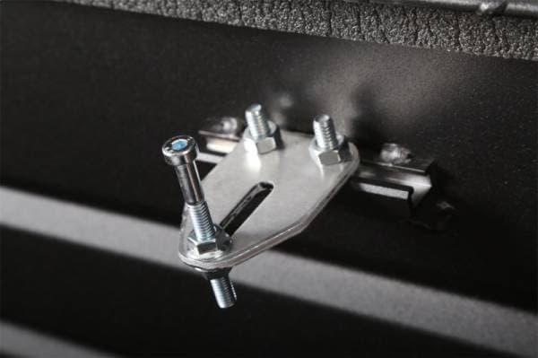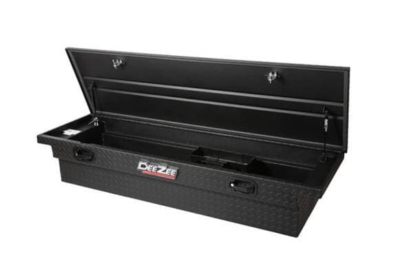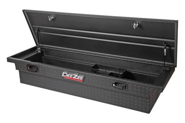 Dee Zee Tool Box - Red Label Single Lid Crossover. Constructed of heavy duty Brite-Tread aluminum with low profile design. Texture black powder coat, provides a matte black finish while it protects and prevents oxidation. Crown style lid with a full pan double-V stiffener for superior rigidity. Other features: lockable powder coated black pull handles, dampened gas shocks, closed cell foam gasket, and self-adjusting strikers. Removable plastic tool tray to help keep small items organized.