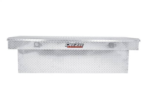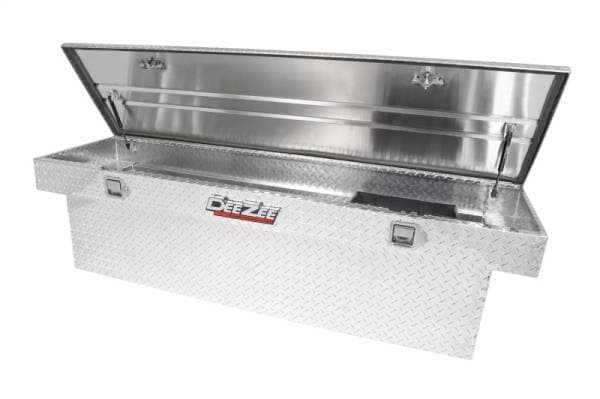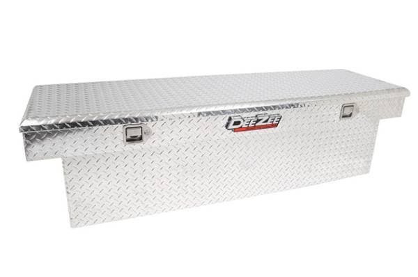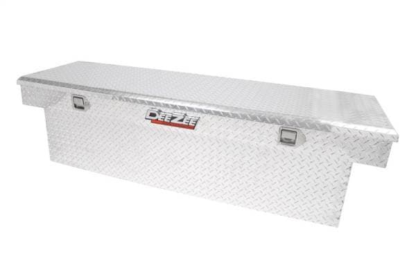 Dee Zee Tool Box - Red Label Single Lid Crossover. Constructed of heavy duty Brite-Tread aluminum with extra deep design for extra storage space. Crown style lid with a full pan double-V stiffener for superior rigidity. Other features: lockable stainless steel paddle handles, dampened gas shocks, closed cell foam gasket, and self-adjusting strikers. Removable plastic tool tray to help keep small items organized.
