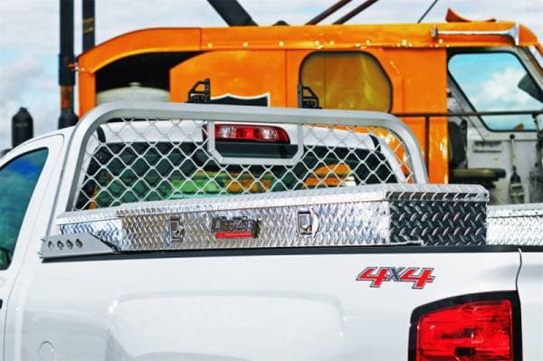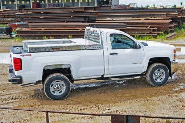 Dee Zee Tool Box - Red Label Side Mount Boxes. Constructed of heavy duty Brite-Tread aluminum. Crown style lid for superior rigidity. Other features: lockable stainless steel paddle handles, dampened gas shocks, closed cell foam gasket, and self-adjusting strikers. Great storage by themselves or matched with our crossover Tool Boxes.