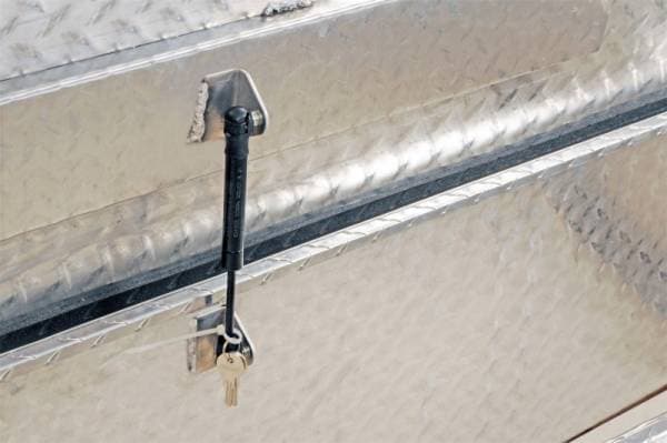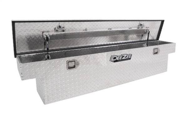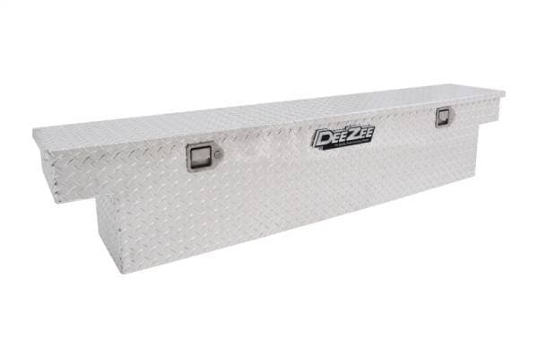 Dee Zee Tool Box - Specially Narrow Crossover box. Constructed of durable Brite-Tread aluminum with narrow design for subtle look. Other features: lockable push-button handles, dampened gas shocks, closed cell foam gasket, and self-adjusting strikers. J-Bolt mounting hardware included. Ideal for todays short bed crew cab or any truck that doesnt want to lose valuable bed space.