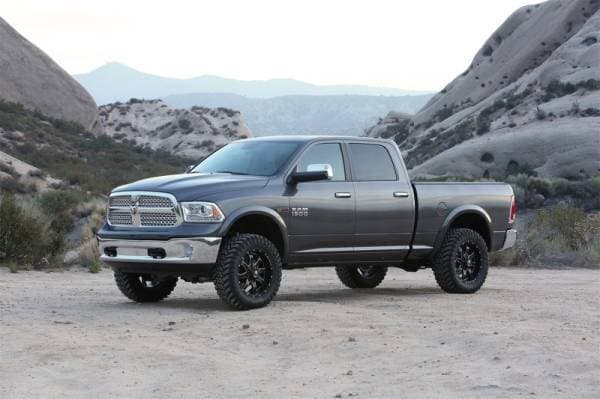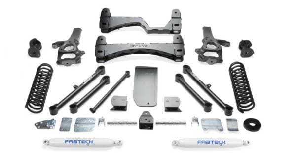 Our Dodge 1500 6 system features Fabtechs proven IFS technology with extended length steering knuckles for proper factory electronic stability control functionality. Heavy duty 1/4 thick steel lower control arm crossmembers provide superior ground clearance while the integrated front differential skid plate adds protection to the drivetrain. In the Basic system lift is accomplished via a steel coilover shock spacer system retaining the stock ride characteristics of the vehicle. Rear lift is accomplished with replacement performance coil springs along with new upper and lower link arms for the proper pinion angle without loss of ground clearance.