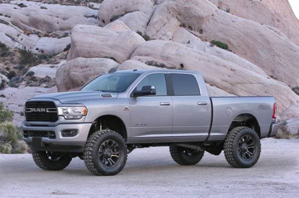 Improving on the Ram suspension design, Fabtech offers their trademark Radius Arms in a complete lift kit system. These exclusive tubular Radius Arms have recognizable dimple die side plates for superior strength and a signature of quality. The rugged Arms provide increased caster for use with oversized tires and lifted suspension heights. The factory front Ram coil spring has a noticeable bow to it with a very high spring rate for the weight rating of the vehicle. This creates a harsh ride with a nervous feel from the suspension. To correct this, Fabtech uses a straight vertical coil design. In order to utilize a straight coil, the lower spring seat mount must be modified via a Fabtech patented angular spring mount that attaches to the stock seat. This eliminates the bow to the spring and allows for a lower rate with a straight coil for a supple ride without sacrificing load carrying capacity. A Fabtech exclusive. For the rear, this lift kit has the perfect balance between ride quality and retaining the factory carrying capacity. By utilizing a dual rate spring design, it provides a good highway ride in the first stage of compression and then the second stage handles heavy loads. Heavy duty 1/4" thick steel front and rear Track Bar drop brackets center the axles under the vehicle with the new ride height. A Fabtech innovation with this Ram lift kit is the heavy duty steel front bump extensions. They retain the stock bump stop cushions for progressive damping and will not allow the suspension to over travel. This is a superior feature compared to replacement long length urethane bump stops as they can push out under harsh conditions. FEATURES: Fabtech?s trademark Radius Arms with recognizable dimple die side plates providing additional strength and increased caster. Front straight Coil Springs with Fabtech?s patented angled mounts for smooth ride. Heavy duty Track Bar drop brackets center the axles under vehicle for proper tracking. Dual rate rear coil spri