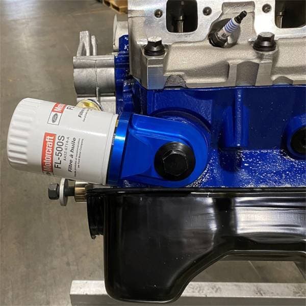 Adaptor screws onto original oil filter location and allows rotation of filter to provide clearance for engine swaps and chassis modifications. Fits most Ford small and big block pushrod engines with 3/4-16 thread filter mount. Uses 22mm thread Ford Racing CM-6731-FL820, Motorcraft FL-820, or FL-820S filters for large return flow path and shorter case, can also use Motorcraft FL-500 or FL-500S filter