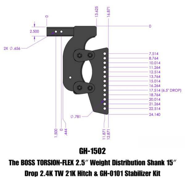 The BOSS TORSION-FLEX 2.5" Weight Distribution Shank 15" Drop 2.4K TW 21K Hitch & GH-0101 Stabilizer Kit