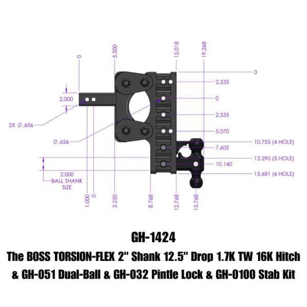 The BOSS TORSION-FLEX 2" Shank 12.5" Drop 1.7K TW 16K Hitch & GH-051 Dual-Ball & GH-032 Pintle Lock & GH-0100 Stab Kit