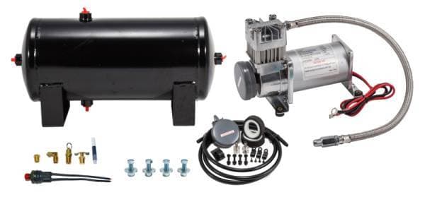 1.5 gallon air tank (Five 1/4" NPT ports), all steel construction, manufactured to SAE J10 and FMVSS 121 standards. Made in the USA.; All necessary fittings and mounting hardware included; "Snorkel" air intake relocation kit included; 110/145 PSI pressure switch included; 150 PSI sealed compressor